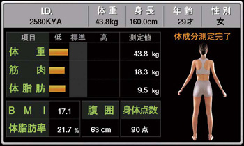 IN BODY(インボディ)高精度体成分分析装置では以下の項目が測定できます。当院ではリハビリやEMS、体操教室の評価に使います。全身の筋肉バランスとその他内臓脂肪や基礎代謝量も分かります。